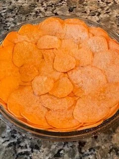 3. Peel sweet potatoes and slice very thin, using a mandolin if possible. Layer sweet potatoes in pie plate overlapping to completely cover the bottom of the pie plate. For the sides trim potatoes if needed so they lay flat all the way around the side of the pie plate. Continue this until you have 4 to 5 layers thick. After you have all layers done spray potatoes with nonstick cooking spray.