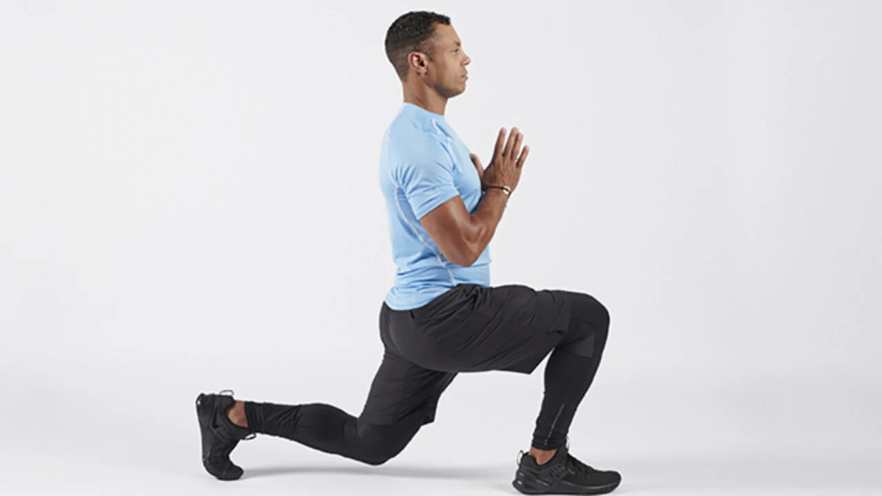 The lunge is performed by stepping one foot forward and squating down to touch your other knee to the ground. The further you step out the deeper you are strengthening your glute. Proper form is keeping your knee behind your toes and chest facing forward.